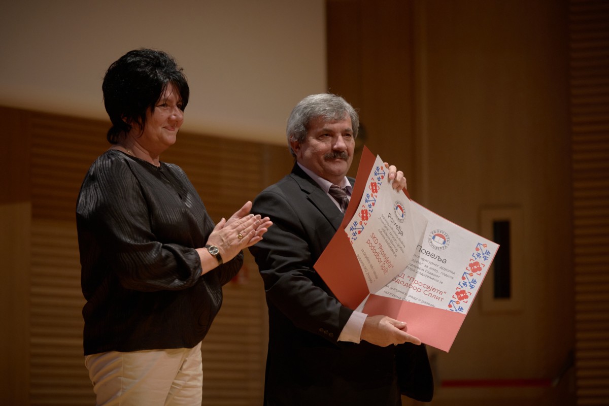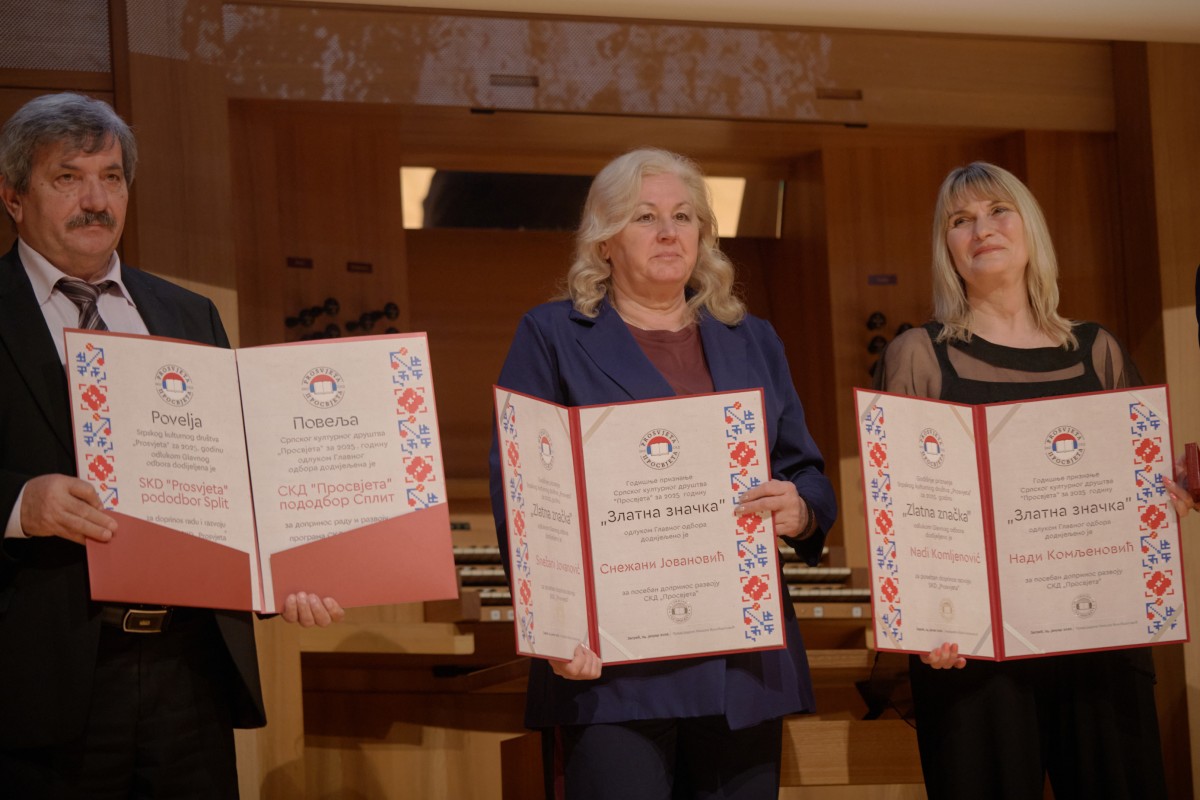Повеља СКД-а “Просвјета” намијењена истакнутим институцијама за допринос раду и развоју програма “Просвјете” у 2025. години, одлучио је Главни одбор, додијељена је пододбору у Сплиту као признање за дугогодишњи, предан и континуиран рад на очувању и афирмацији српске културе, језика, ћириличног писма и традиције на подручју града Сплита и Сплитско-далматинске жупаније, али и изградњи и развијању добрих међунационалних односа у Сплиту.